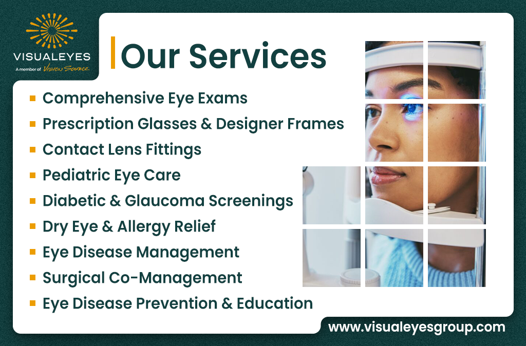 At Visual Eyes, we make it easy. Whether you’re coming in for a routine eye exam, new prescription glasses, contact lenses, or disease screening, our friendly, professional team is here to serve you in a comfortable, supportive environment.